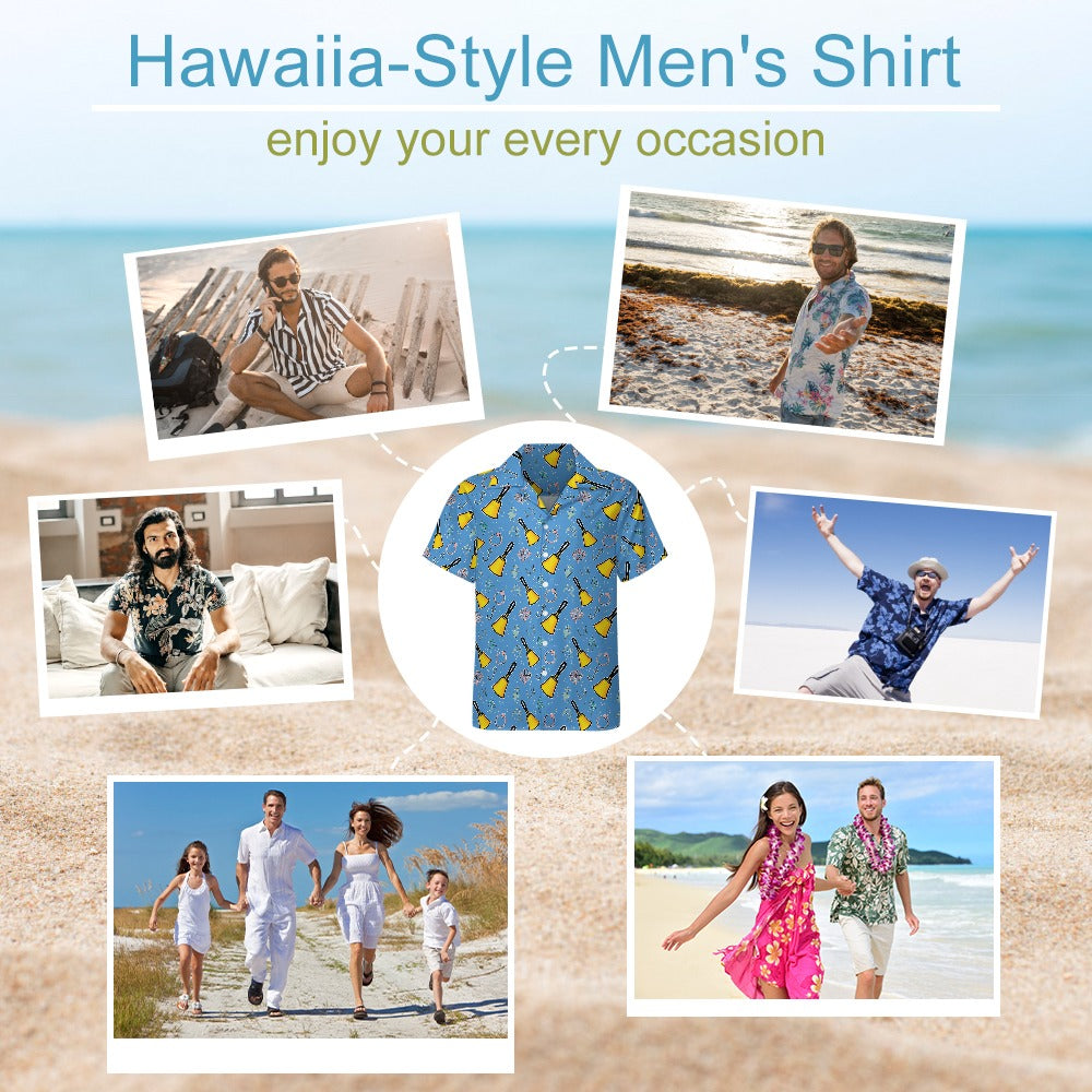 🔔 Cartoon Handbell Cuban Collar Shirt – Blue