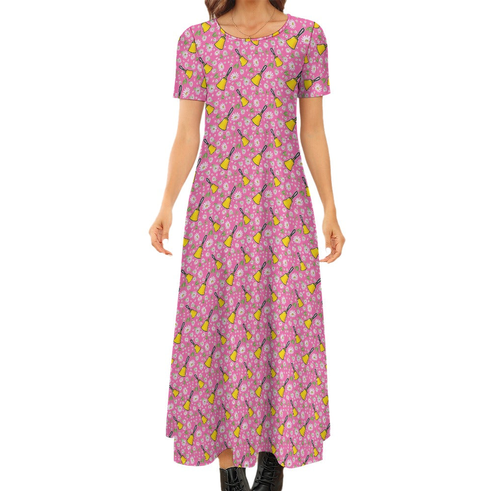 Pink Handbells & Daisies Round Neck Short Sleeve Dress