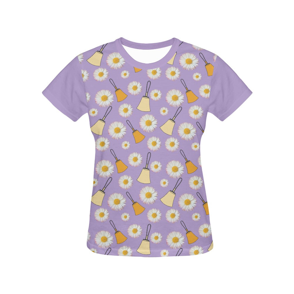Purple Handbells & Daisies Women's All Over Print T-shirt - Solid Sleeves